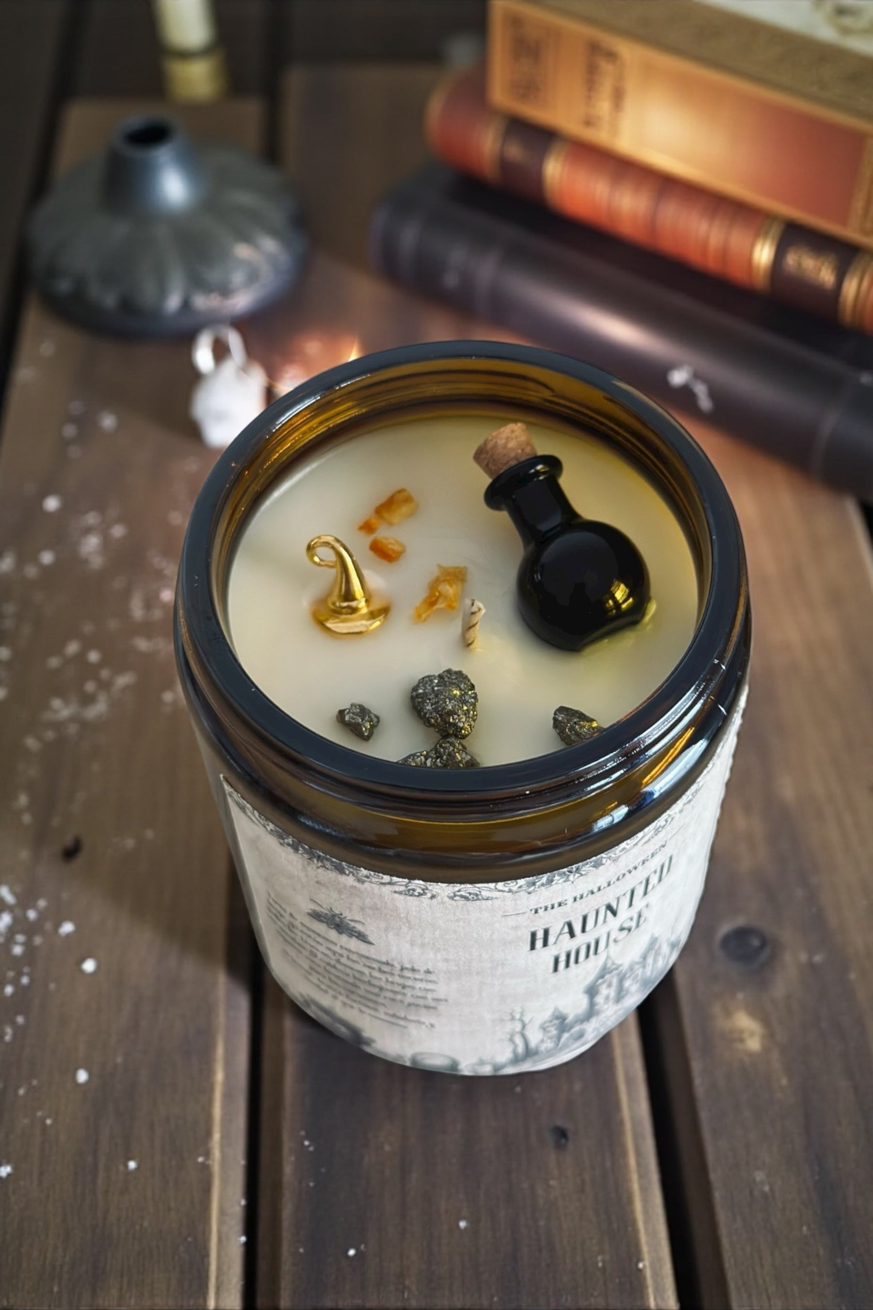 Cuando la luna apenas ilumina los antiguos ventanales y el viento gime a través de cristaleras rotas, la vela HAUNTED HOUSE se enciende como un susurro en el tiempo. Su fragancia hechiza los sentidos: tarta caliente de manzana, con canela y especias oscuras, flotando en el aire como un secreto prohibido.